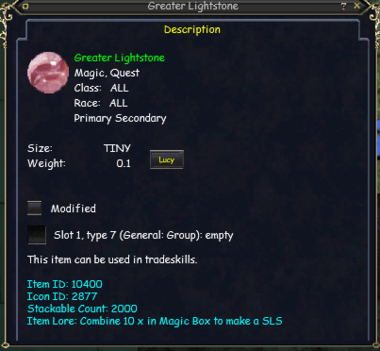 '''Greater Lightstones''' can be found from [[Willowisp|willowisps]] in [[Jaggedpine Forest]]. They are used to make [[Superior Lightstone|Superior Lightstones]] by combining 10 of them in the [[Magic box|magic box]]. | '''Greater Lightstones''' can be found from [[Willowisp|willowisps]] in [[Jaggedpine Forest]]. They are used to make [[Superior Lightstone|Superior Lightstones]] by combining 10 of them in the [[Magic box|magic box]]. | ||