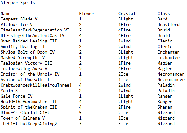 Amilie threw together this quick table of 10.5 Sleepers Tomb spells that corrects some of the recipes.