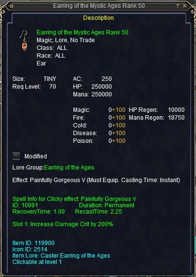 Because of the expense of creating the Earring of the Ages, and the fact that the worn effect does not begin to appear until level 10, few players have begun this quest. It is also usually not started until the Ring of the Ages quest has been completed to level 1,000.