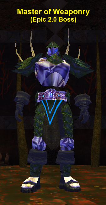 He is not KoS. Once attacked, he will spawn several adds at fixed health percentages. When the adds spawn, kill them, then re-attack Master of Weaponry. Once he dies, his corpse will contain Incomplete Epic Book 2.0.