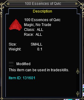 - 1 x 100 Essence of XX from the corresponding tier, starting with 100 Essence of Qvic. To get this item, hail the Essence Trader NPC in the Crafter's Guild and get the essence quest needed, then turn in 4 non-stacked essences until all 100 have been turned in and the quest is completed. You can also talk with him again once you have the quest to do a bulk turn in.